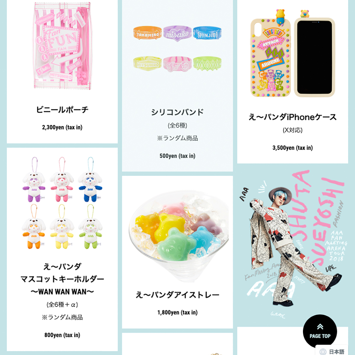 a-nationオフィシャルグッズの販売サイトです。5年ほどa-nationのグッズ販売ページを担当してきましたが、この年からグッズ販売に特化したUIに改善し、開催会場別のソート機能などオリジナルのインターフェースを盛り込みました。 こちらをテンプレートとして、翌年分も作成されています。